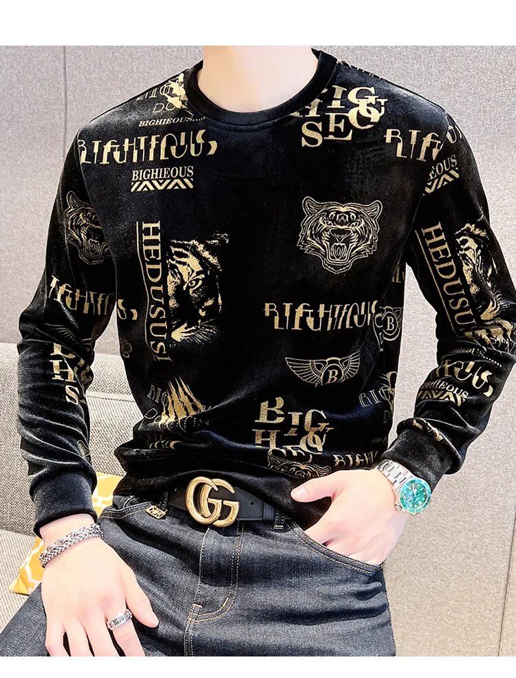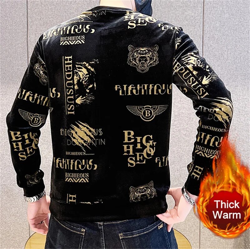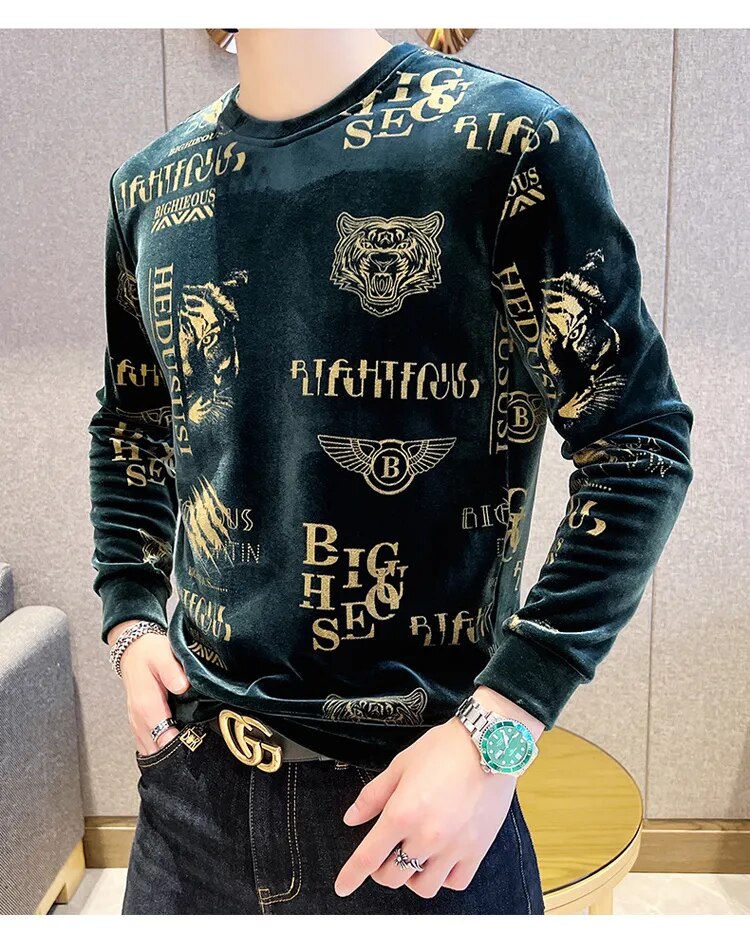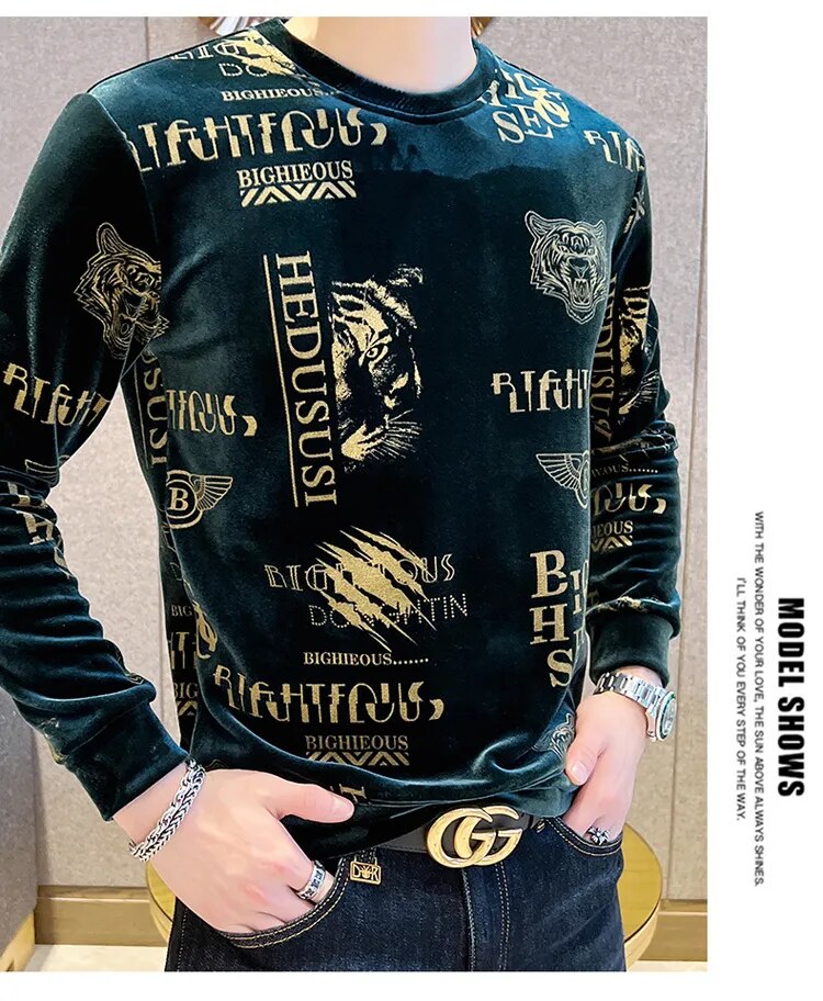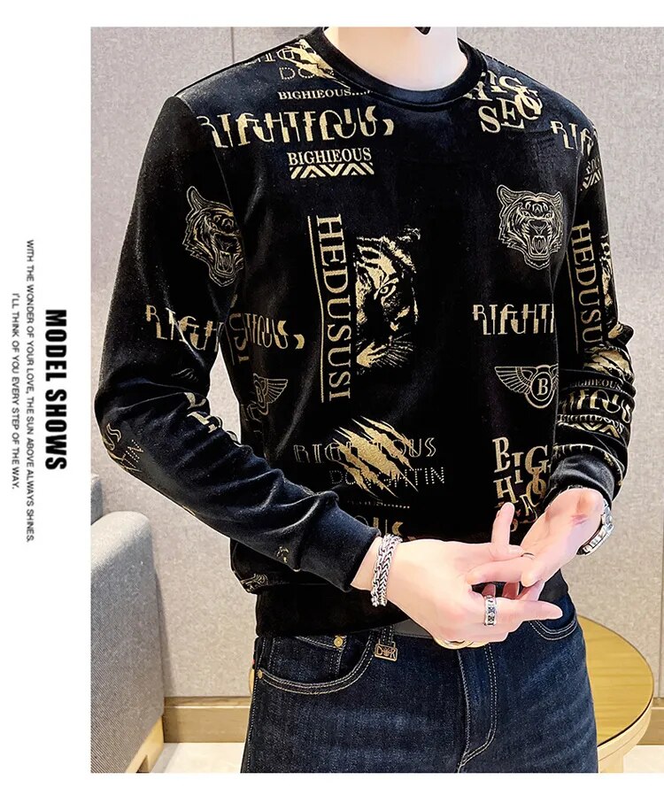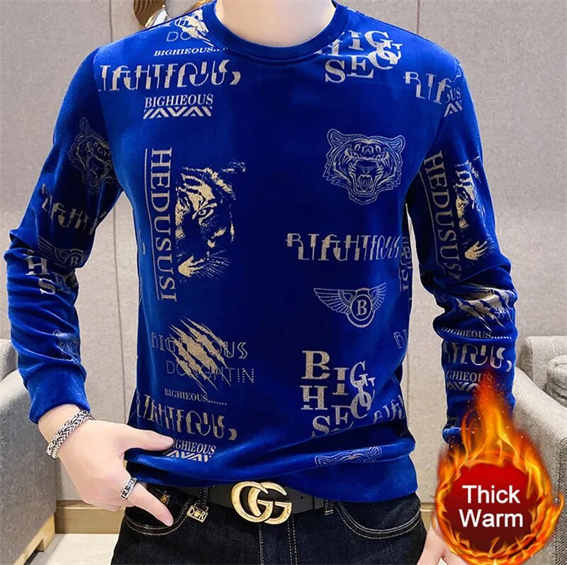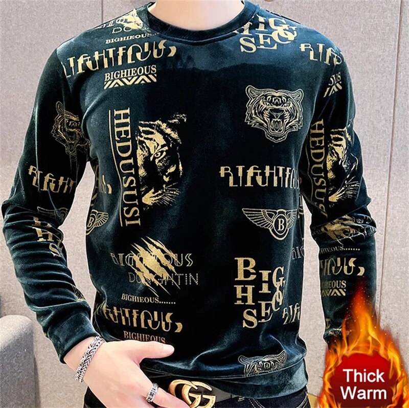 Luxury Fashion Tiger Head Print Velvet T Shirt Men Winter Fleece Warm T Shirt Club Outfits Tshirt Men T Shirt Homme Men Clothing