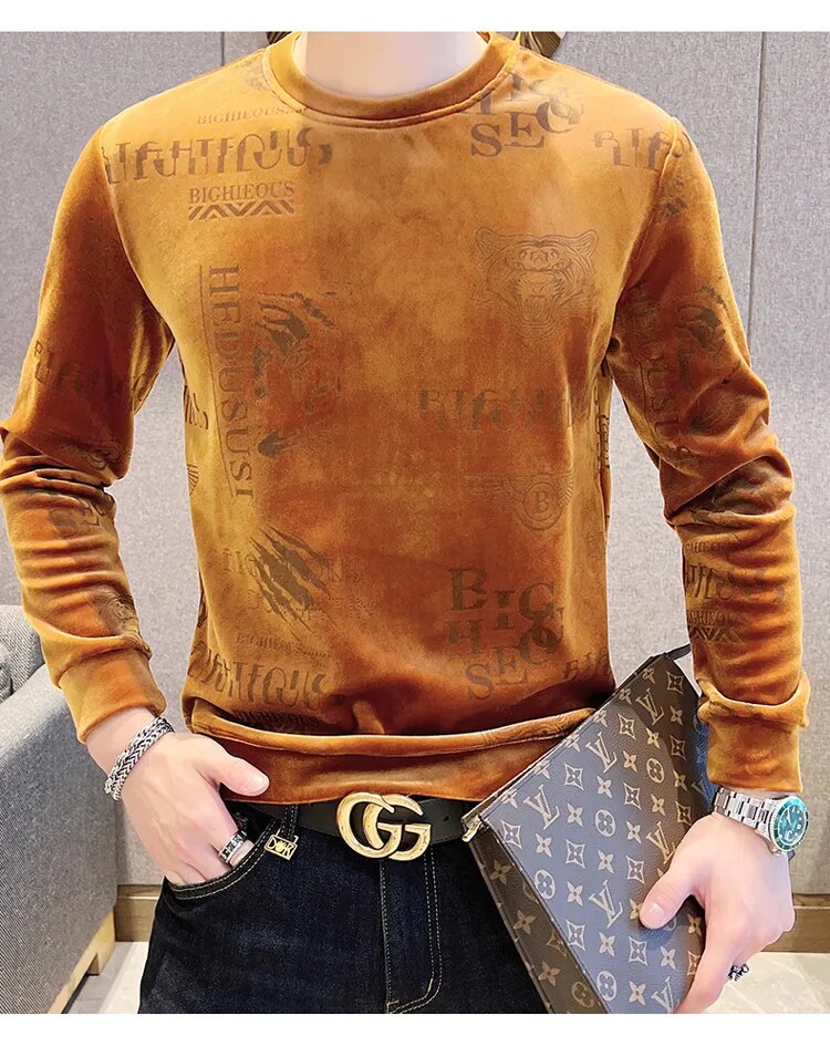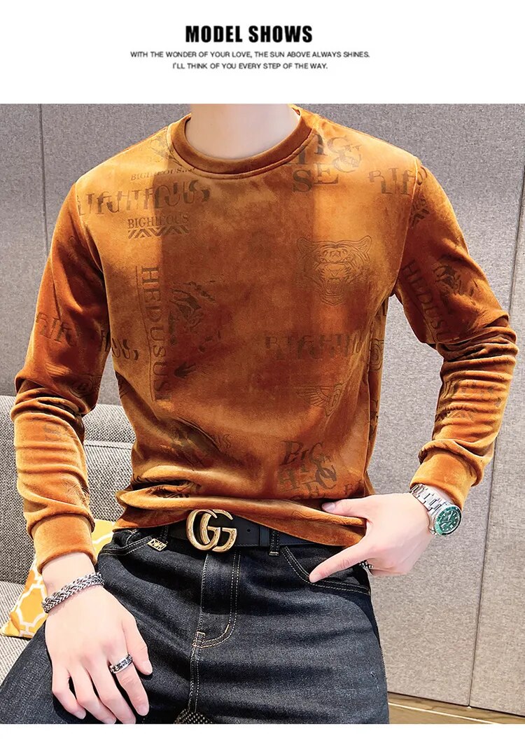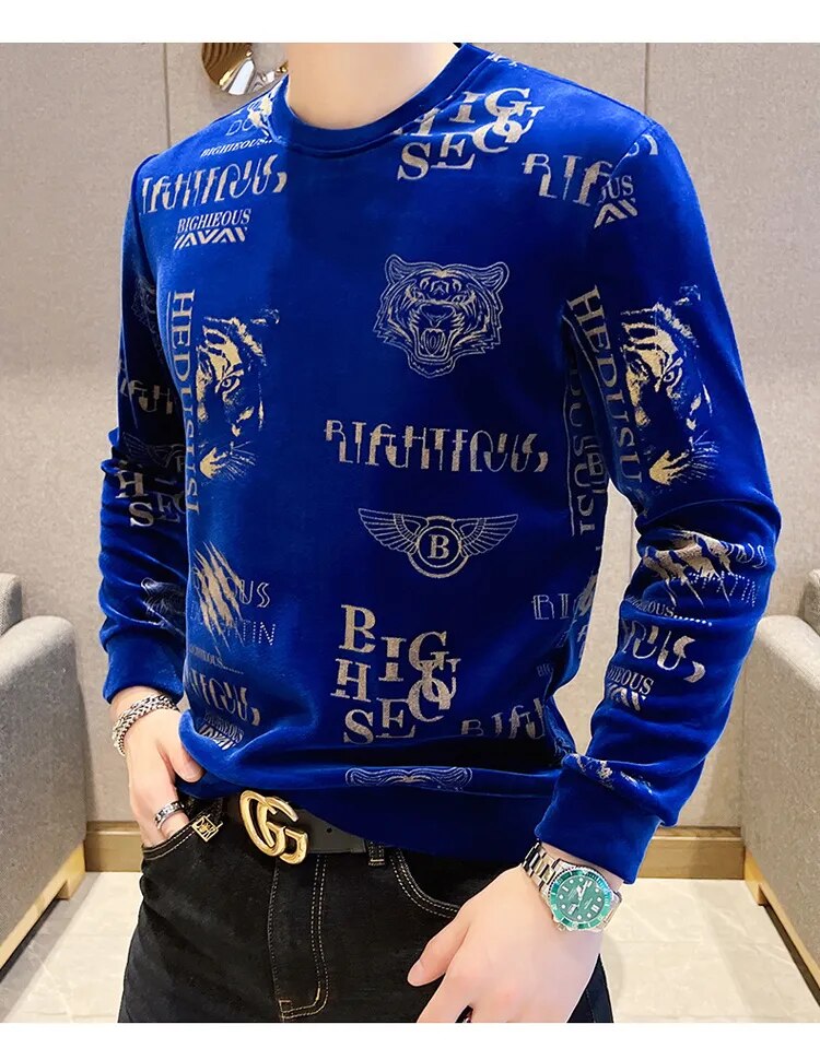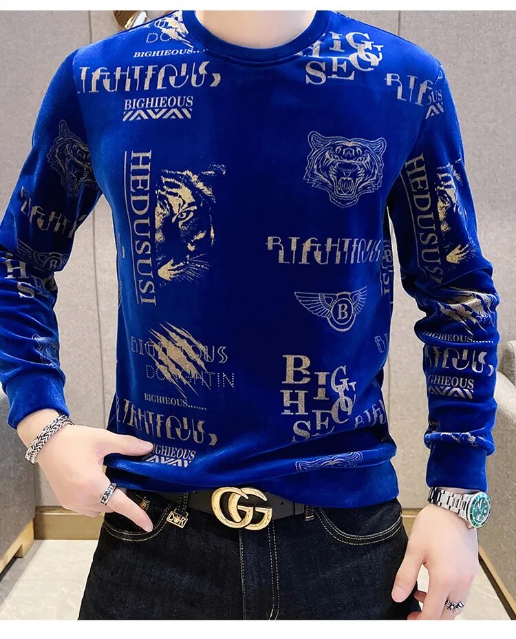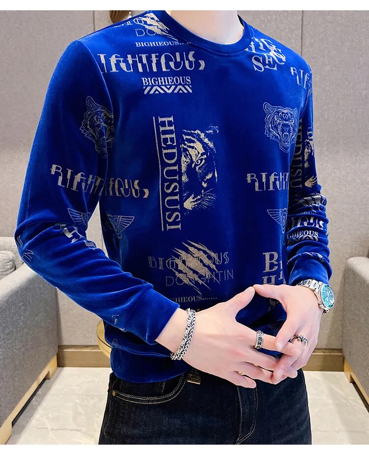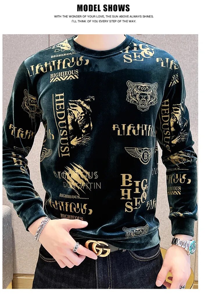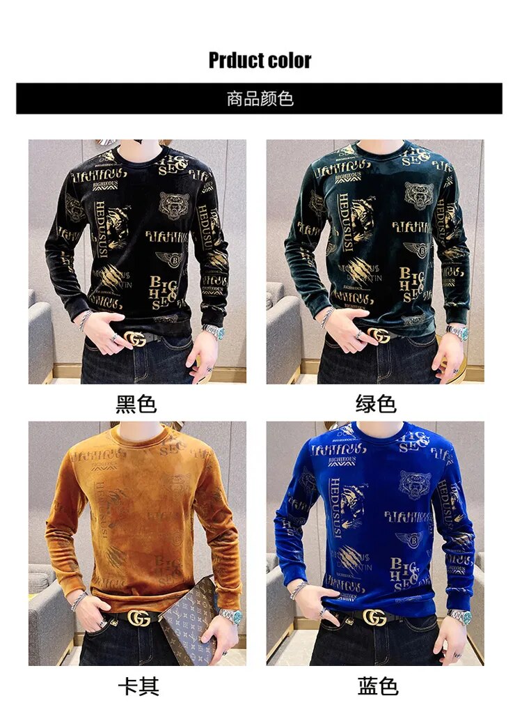 Luxury Fashion Tiger Head Print Velvet T Shirt Men Winter Fleece Warm T Shirt Club Outfits Tshirt Men T Shirt Homme Men Clothing